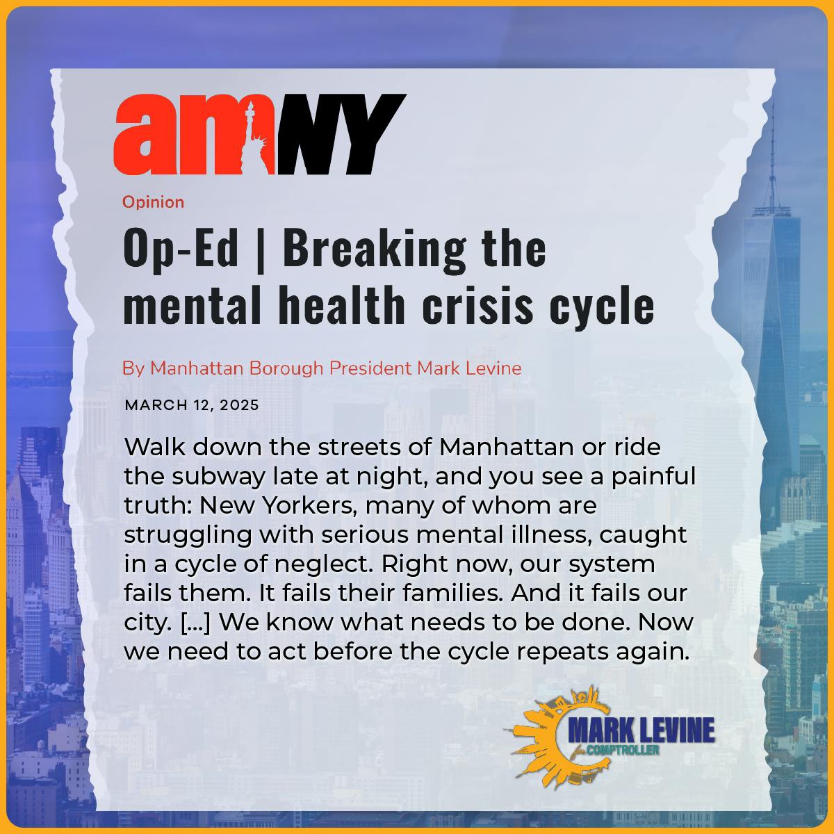 Mark has long championed real solutions to this crisis. As Comptroller, he’ll focus breaking this cycle and getting people into the care they need:
